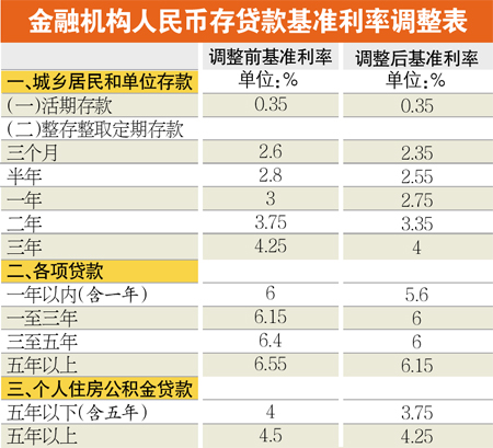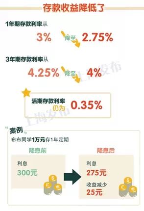 一年期存款基准利率下调0.25个百分点至2.75%,10万元定期存款一年下来利息少了250元。
