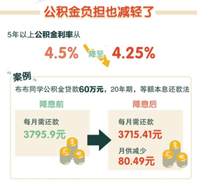 涉及面最广的5年以上公积金利率从4.5%降至4.25%。如果公积金贷款60万元,20年期,等额本息还款法,月供减少80.49元。
