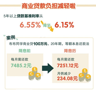 涉及面最广的5年以上贷款基准利率从6.55%降至6.15%。如果商业贷100万元,20年期,等额本息还款法,月供减少234.08元。