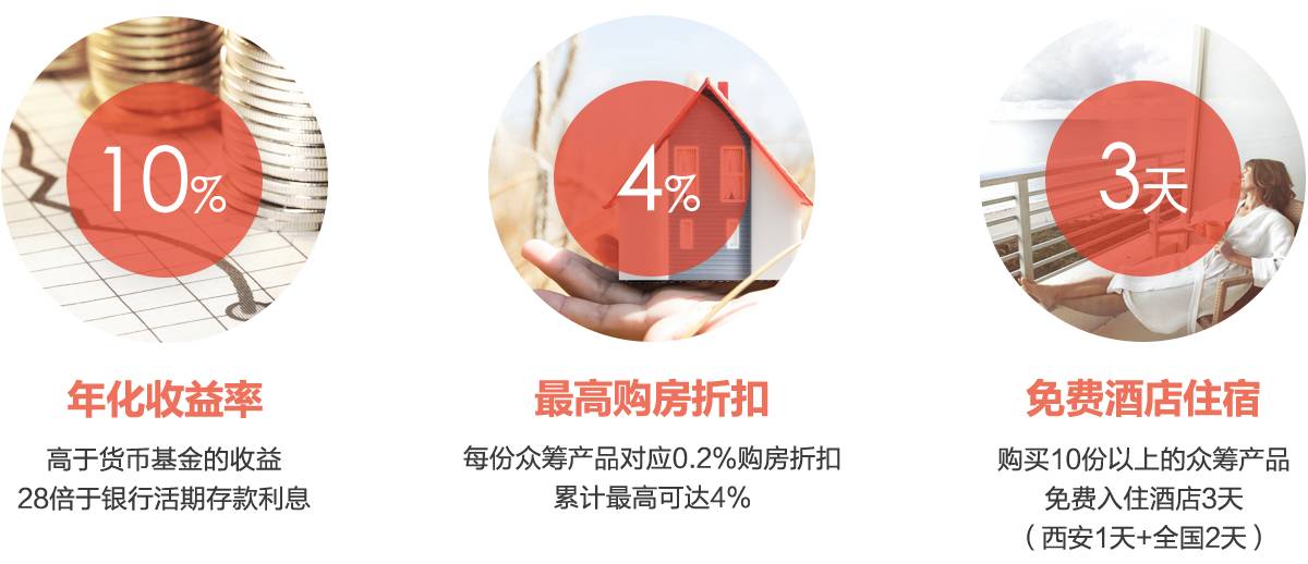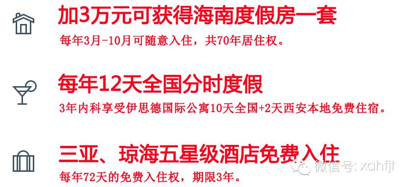 购买点心贷众筹产品,享10%年化收益率的现金收益、最高4%购房折扣,有机会享3天免费酒店住宿。购房加3万元得70年海南度假房居住权,另赠送每年12天全国分时度假和三亚、琼海五星级酒店每年72天免费入住权,期限3年。