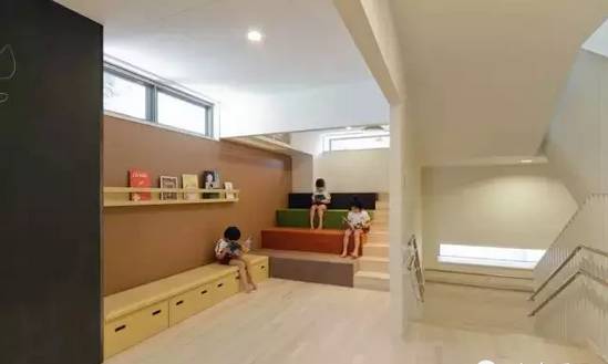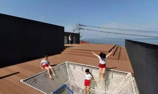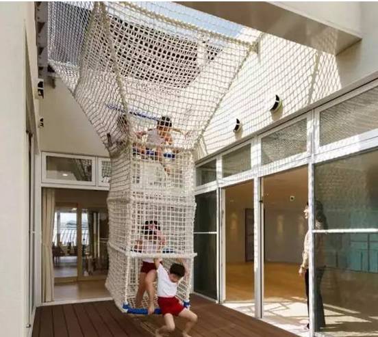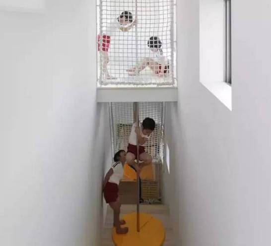 幼儿园尽可能地挖掘了室内的娱乐性,比如屋顶的蹦床和从屋顶到室内长长的滑梯。喜欢“心跳”感的孩子们伴随尖叫声顺梯而下,这可以说是“勇敢者的游戏”。在爬高上低的过程里,无形中也增加了孩子们的运动量。