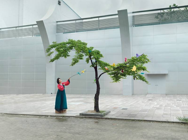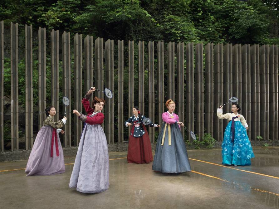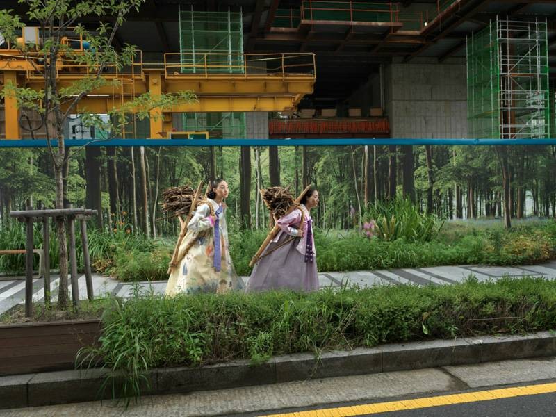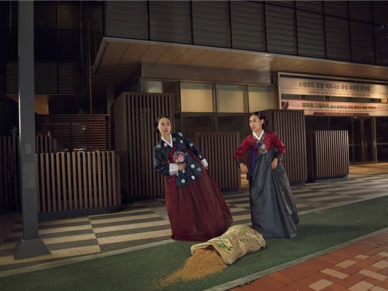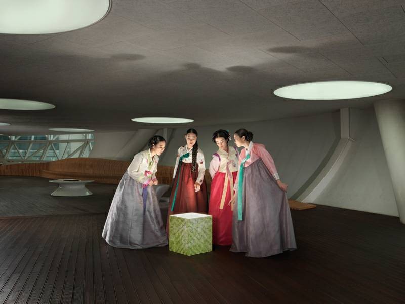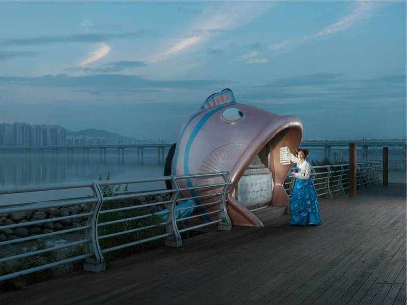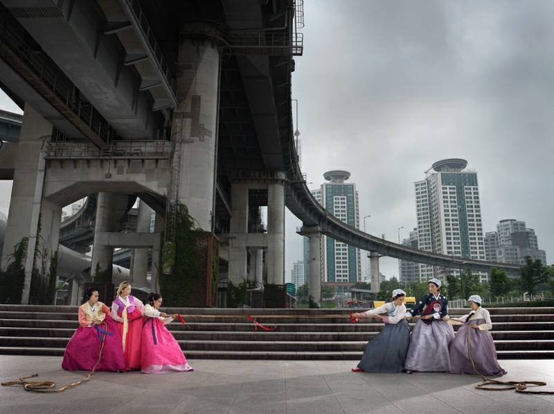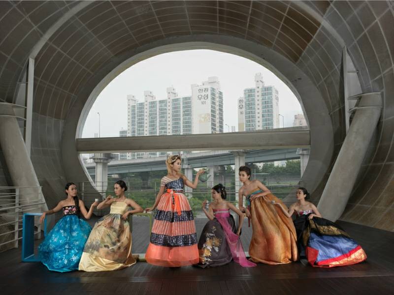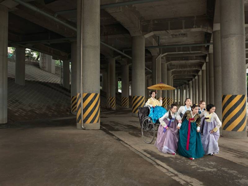 “大韩印象”(Korea)是女摄影师Julia Fullerton-Batten在韩国旅行拍摄出的作品系列之一。该作品将韩国民族服饰与现代气息的背景充分结合,营造出一种时空交错的奇幻氛围。跟随她的脚步,很多有趣生动的形象跃然眼前。 作品展现了年轻的女孩们衣着鲜艳的韩服,在现代化都市首尔中的生活百态。在充满现代化气息的首尔城背景下,她们或辛勤劳作,或翩翩起舞,或盛装出行,或玩闹嬉戏……作品所展现出首尔的现代文明与韩服传统民族文化的碰撞,给人以一种强烈的视觉冲击感。