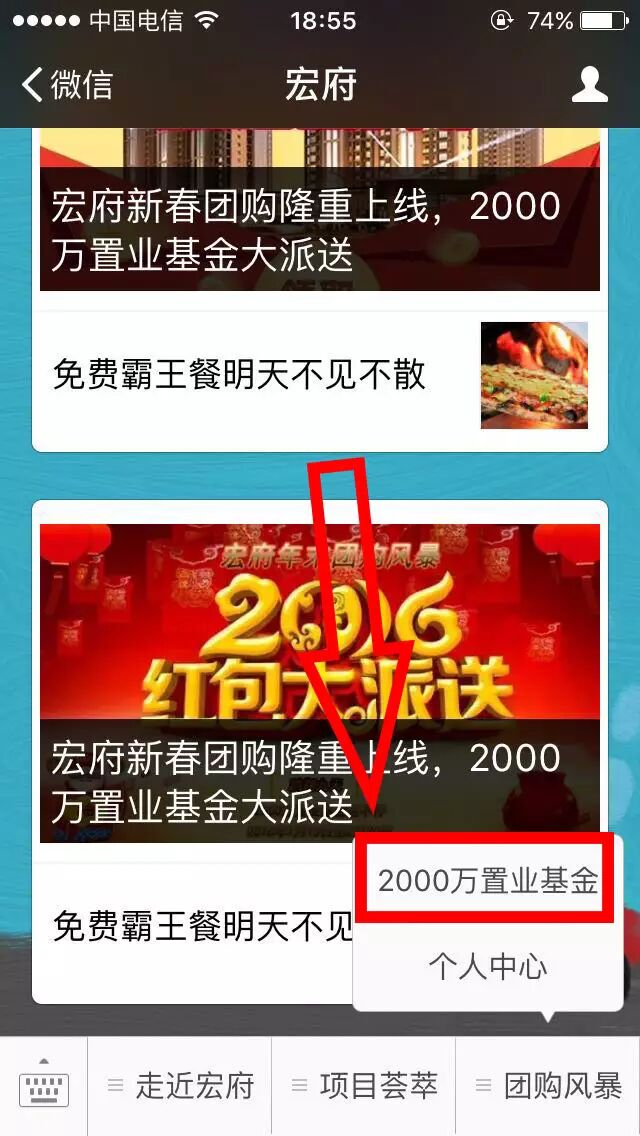 ①进入宏府微信公众号,点击底部菜单栏“团购风暴”——“2000万置业基金”。