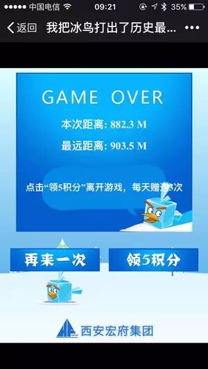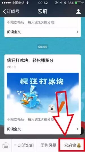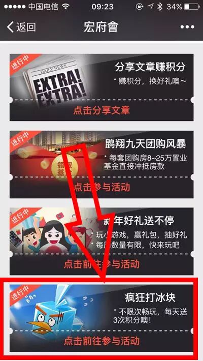 ①进入宏府微信公众平台,点击底部菜单栏"宏府會"。②进入活动页面,点击疯狂打冰块。③开始游戏,操纵白熊击打落下的冰块小鸟,冰块小鸟飞行的距离为自己得分。④完成游戏,领取积分,每天送3次积分噢!