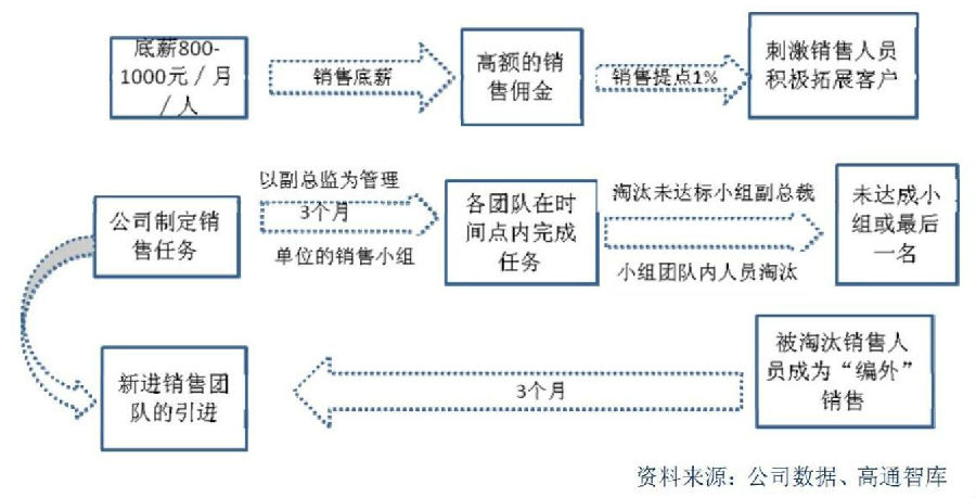 2. 严格的末位淘汰制:淘汰未达销售任务小组,被淘汰人员仍然作为项目的“编外人员”继续项目销售活动,但不属于公司正规编制,新进优秀销售人员的引进,刺激销售团队及人员间的竞争。