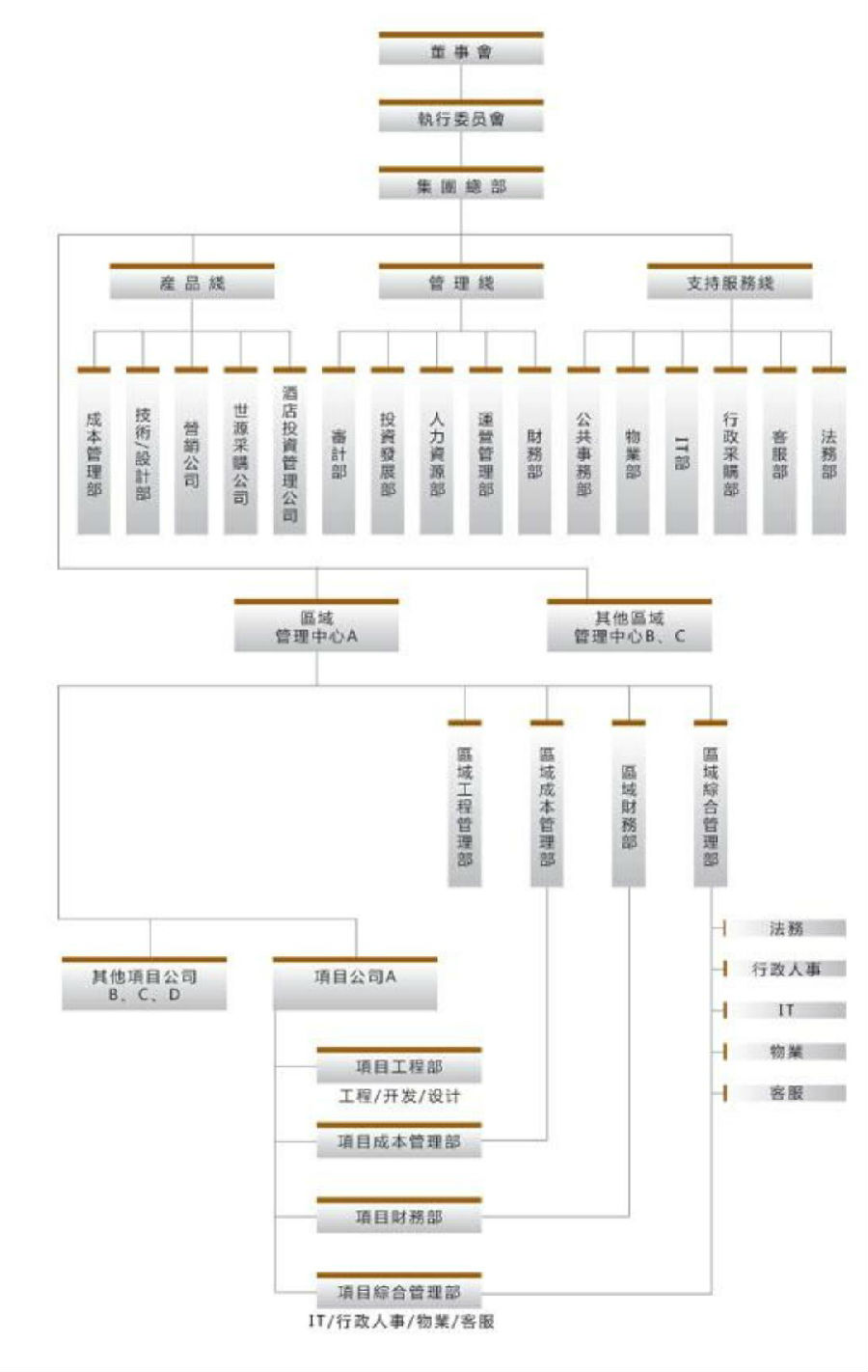 为适应集团发展战略的需要,集团对组织结构进行了较大幅度的调整,将原来的三层次结构优化为二层次结构,从而实现了组织结构的扁平化,提升了组织的运作效率,而且对集团现有的专业资源进行了整合,系统地梳理,清晰和强化了项目开发和物业经营两类业务的运作流程和资源配置。
