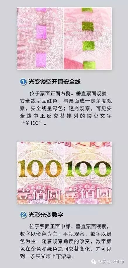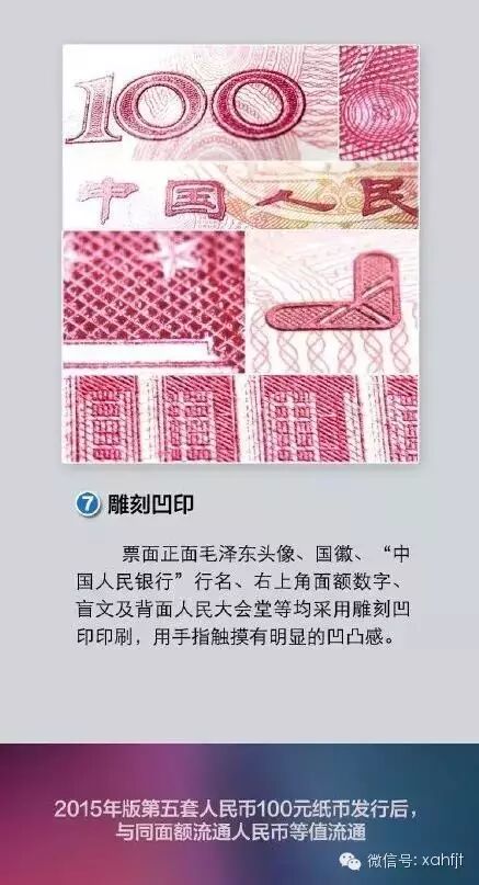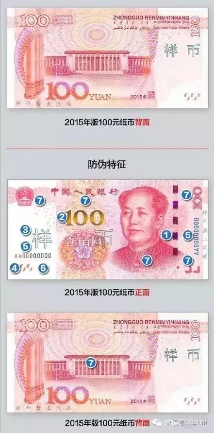 据悉,2015年版第五套人民币100元纸币在保持2005年版第五套人民币100元纸币规格、正背面主图案、主色调、“中国人民银行”行名、国徽、盲文和汉语拼音行名、民族文字等不变的前提下,对部分图案做了适当调整,对整体防伪性能进行了提升。