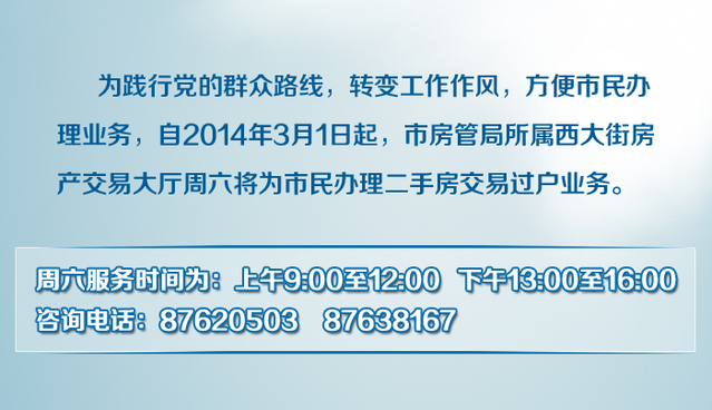 为了方便市民办事,提高办事效率,从3月1日起,市房管局所属西大街房产交易大厅周六正常上班,市民周六也能办理二手房过户手续。周六服务的时间为:上午9:00至12:00, 下午13:00至16:00 。